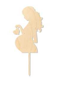 Drewniany topper z sylwetką ciężarnej kobiety będzie doskonały na przyjęcie z okazji narodzin dziecka.