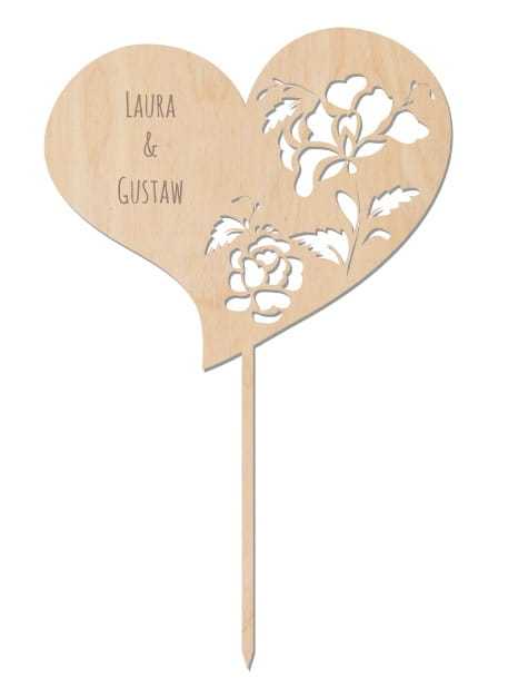 Elegancki topper na ślub z imionami Państwa Młodych wygrawerowanymi na ozdobnym sercu.