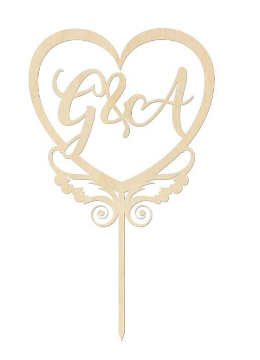 Weselny topper w kształcie ozdobnego serca z inicjałami Młodej Pary wewnątrz. Można pomalować go na wiodący kolor wesela lub zostawić surowy, dzięki czemu nada rustykalnego stylu.