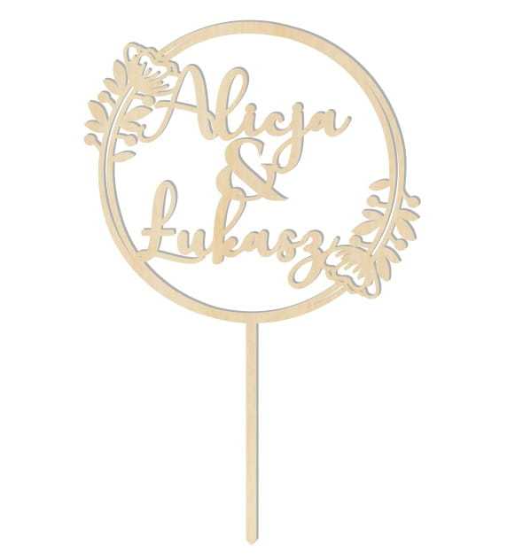 Topper na tort weselny z imionami Nowożeńców, wykonany ze sklejki.