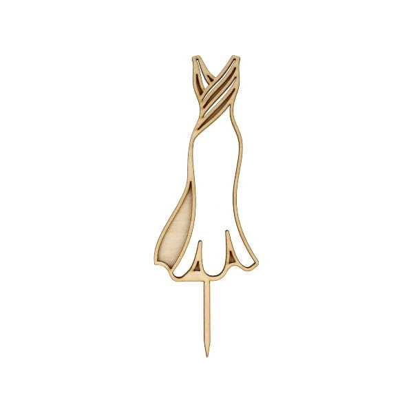 Topper ze sklejki w formie sukni śubnej stanowi oryginalną ozdobę weselnego tortu. Możesz stworzyć dekorację warstwową, łącząc go z topperem OP335 (połączenie widać na drugim zdjęciu).