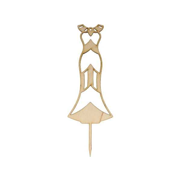 Topper ze sklejki w formie sukni śubnej stanowi oryginalną ozdobę weselnego tortu. Możesz stworzyć dekorację warstwową, łącząc go z topperem OP337 (połączenie widać na drugim zdjęciu).