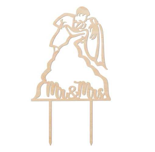 Topper ślubny wykonany ze sklejki przedstawia ażurową młodą parę.