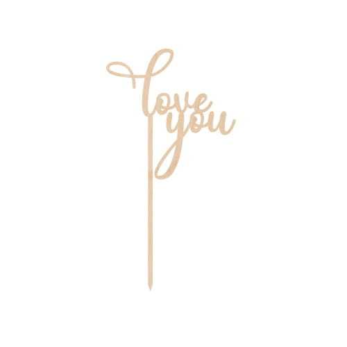 Topper ze sklejki z napisem "love you" uzupełni tort, kosz prezentowy lub bukiet kwiatów.