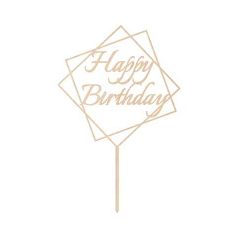 Topper ze sklejki z napisem Happy Birthday w nowoczesnej ramce uzupełni tort, kosz prezentowy lub bukiet kwiatów.