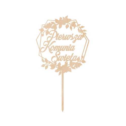 Topper ze sklejki z komunijnym napisem uzupełni tort, kosz prezentowy lub bukiet kwiatów.