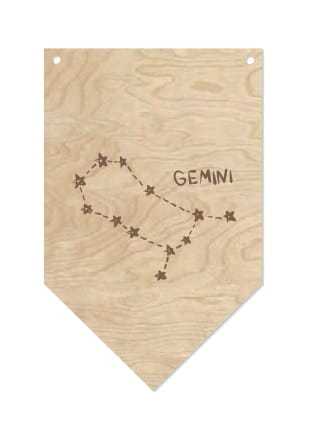 Ozdobny proporczyk ze sklejki z wygrawerowanym gwiazdozbiorem Bliźniąt ułatwi odnalezienie układu na nocnym niebie. Skompletuj wszystkie gwiazdozbiory Zodiaku i udekoruj w ten oryginalny sposób swój dom.