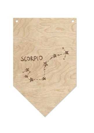 Ozdobny proporczyk ze sklejki z wygrawerowanym gwiazdozbiorem Skorpiona ułatwi odnalezienie układu na nocnym niebie. Skompletuj wszystkie gwiazdozbiory Zodiaku i udekoruj w ten oryginalny sposób swój dom.