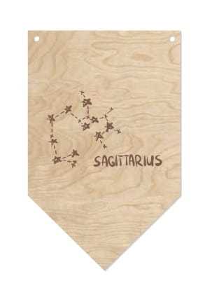 Ozdobny proporczyk ze sklejki z wygrawerowanym gwiazdozbiorem Strzelca ułatwi odnalezienie układu na nocnym niebie. Skompletuj wszystkie gwiazdozbiory Zodiaku i udekoruj w ten oryginalny sposób swój dom.