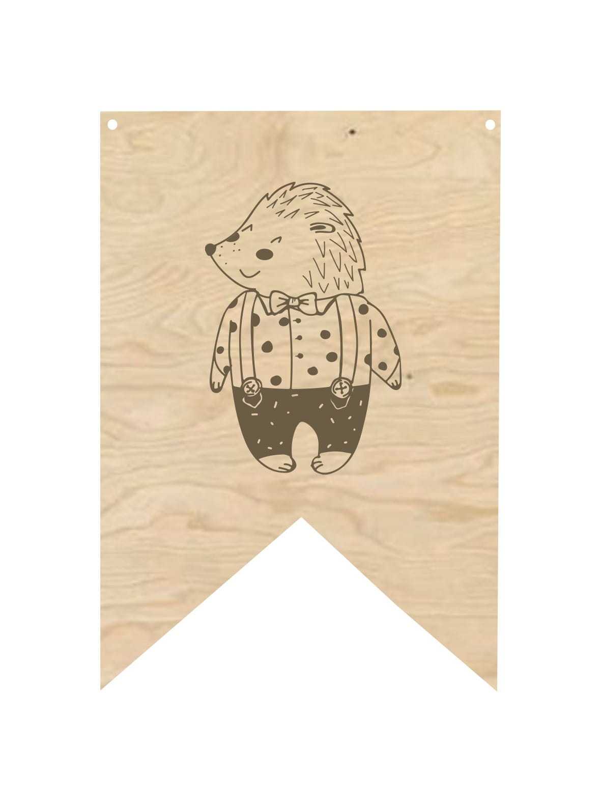 Ozdobny proporczyk ze sklejki z wygrawerowanym jeżem pozwoli stworzyć oryginalną dekorację w pokoju dziecka.
