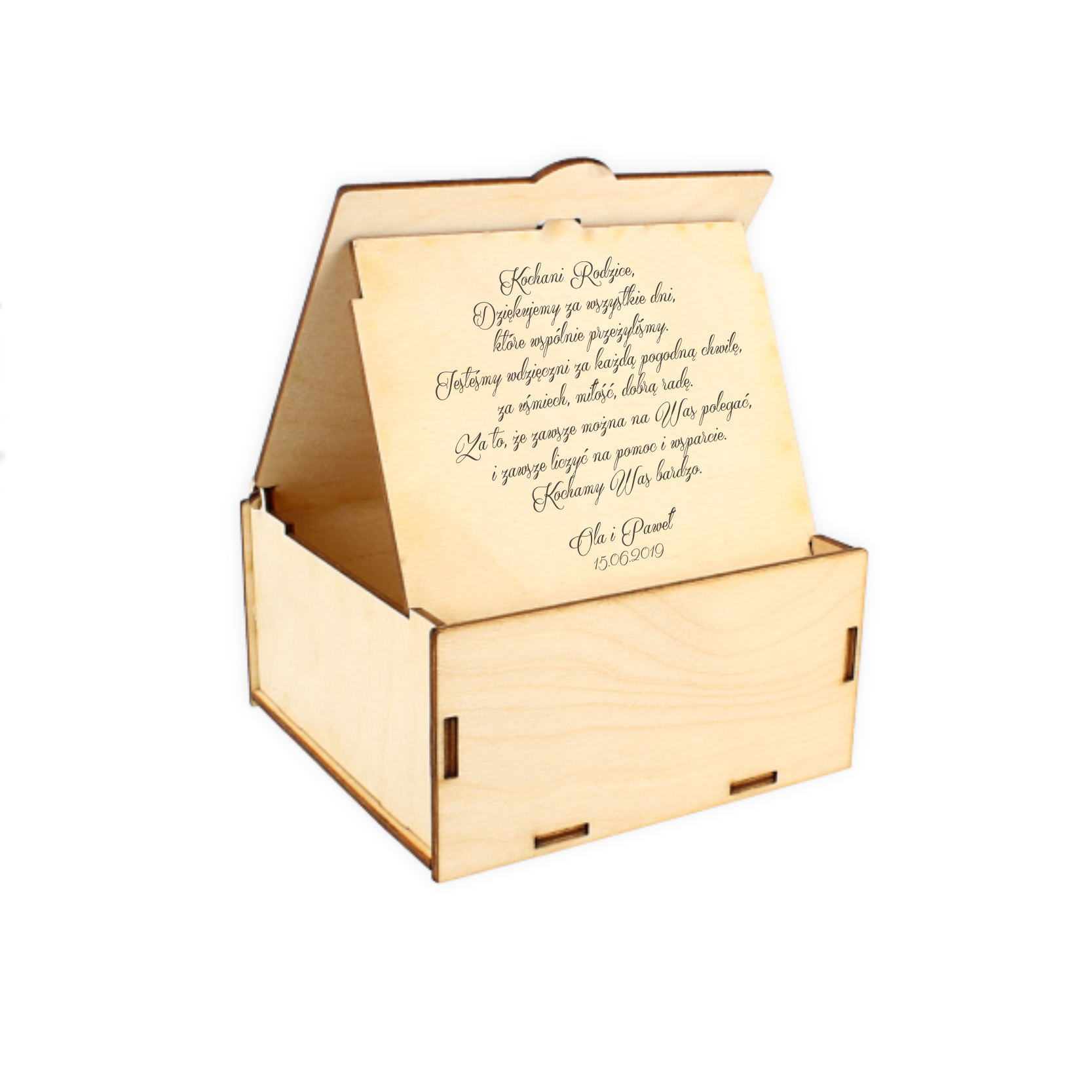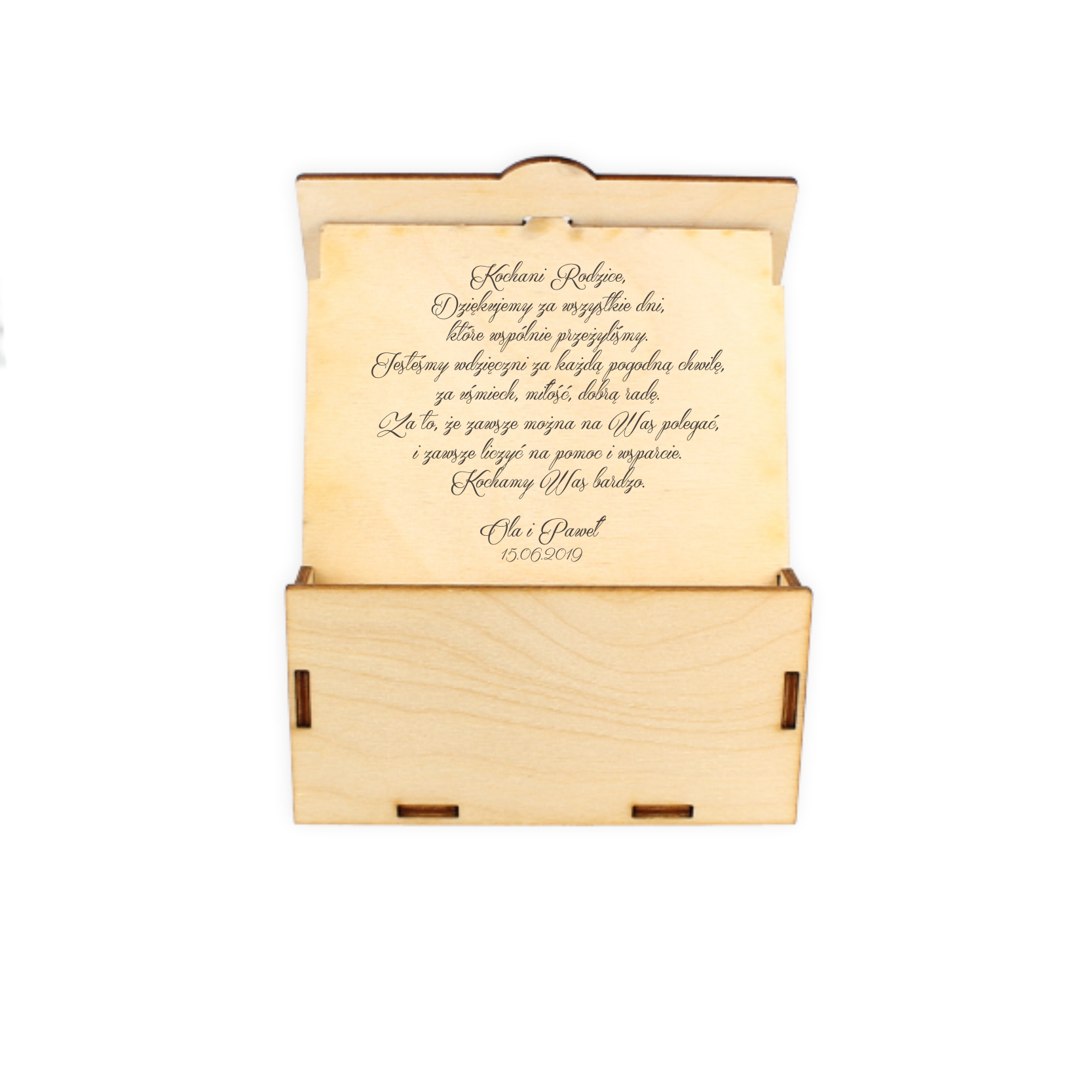 Drewniane pudełko z wyjmowaną tabliczką z wygrawerowanymi życzeniami, wykonane z naturalnej sklejki może posłużyć jako podziękowanie dla rodziców, upominek z okazji ślubu, pamiątka Pierwszej Komunia Św. czy Chrztu Św. Pudełko pomieści bez problemu drobny upominek bądź banknoty, tabliczkę natomiast można wyeksponować w sposób widoczny na zdjęciach.