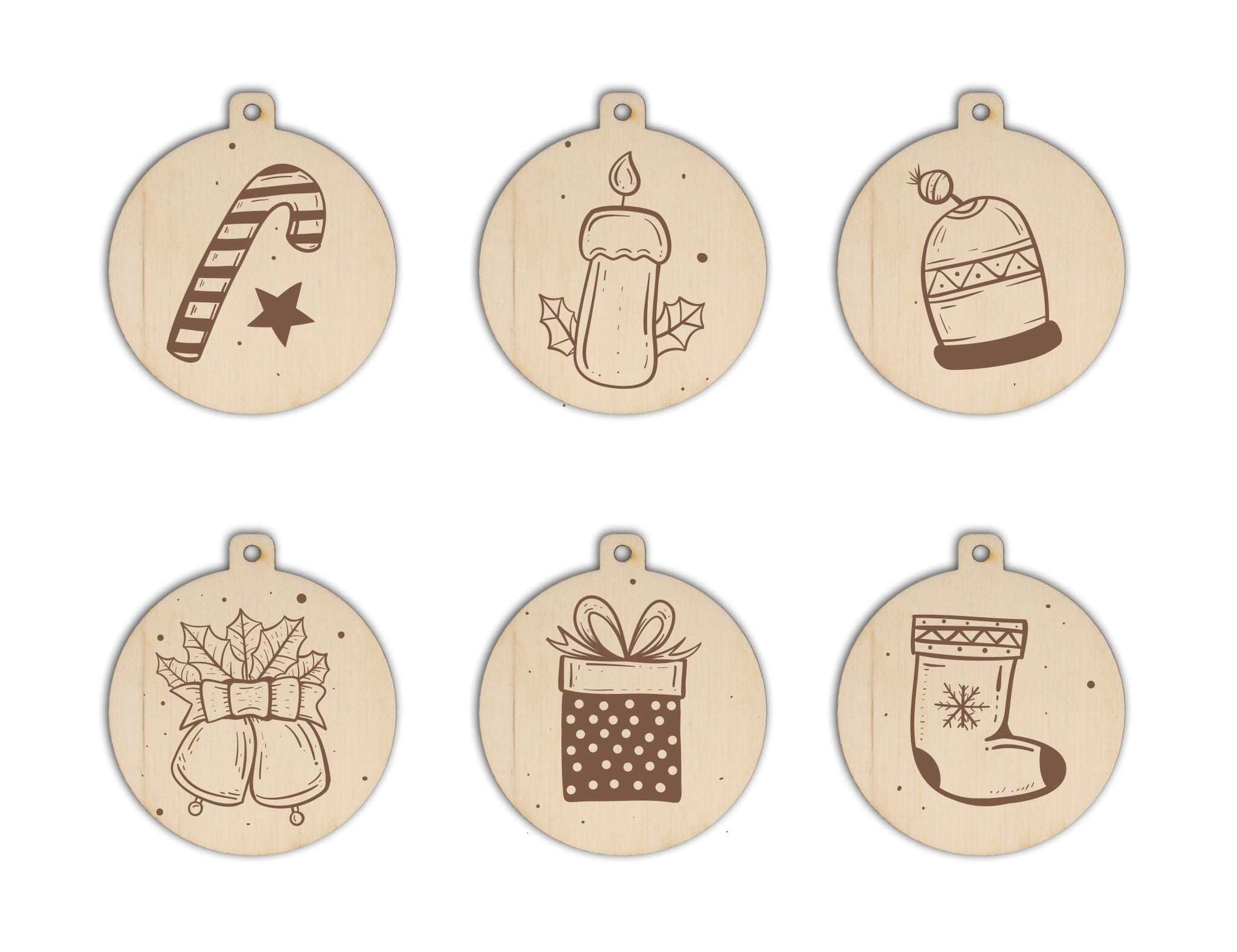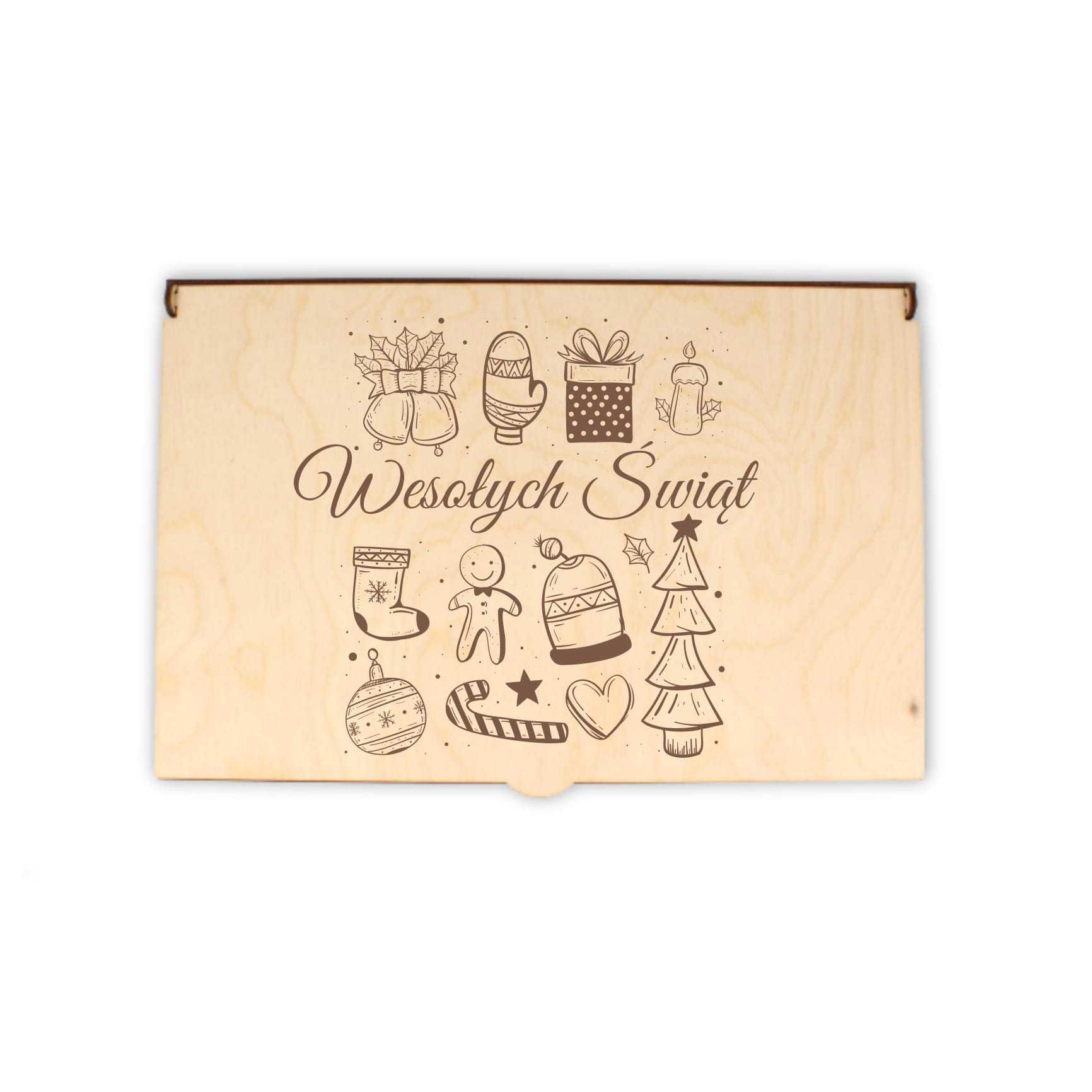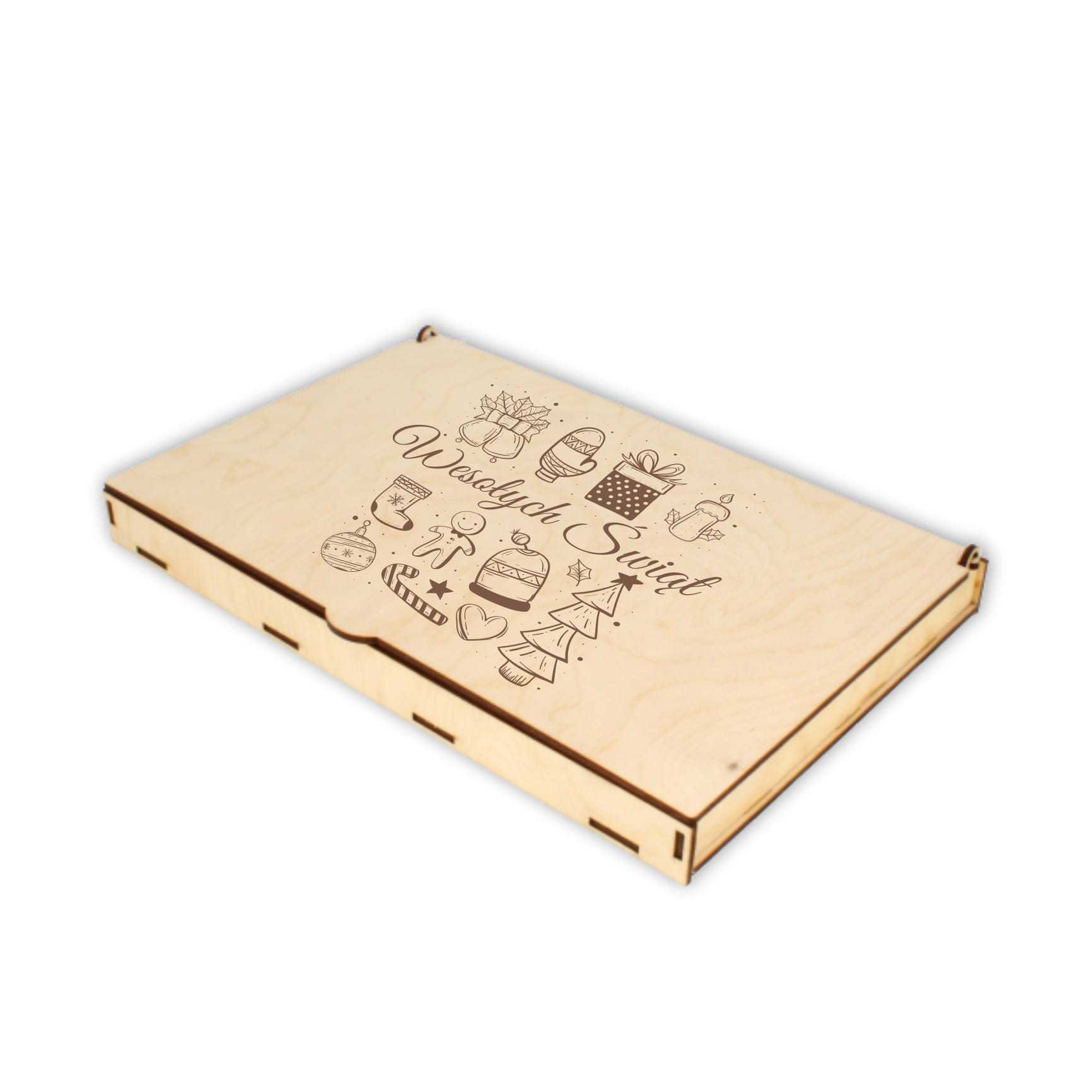 Drewniane pudełko z przegródkami wykonane jest z naturalnej sklejki o grubości 3 mm. Posiada 6 przegródek, z których każda mieści 4 drewniane bombki. Na wieku pudełka wygrawerowane są ozdoby świąteczne i napis "Wesołych Świąt". Motywy z pudełka widnieją również na drewnianych bombkach (6 wzorów).
