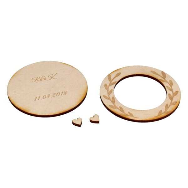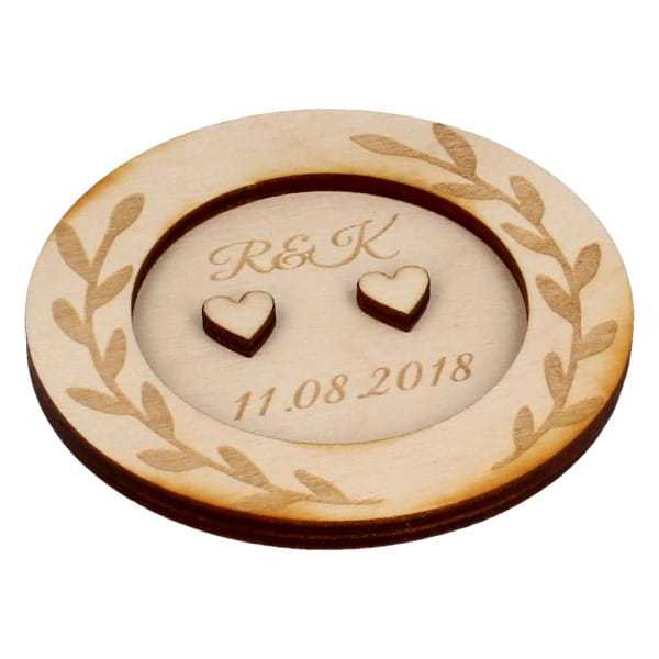 Dwuczęściowe pudełeczko na obrączki ze sklejki z grawerowanymi gałązkami. Wewnątrz mieszczą się dwa serduszka stanowiące oparcie dla obrączek, na dnie wygrawerowane są inicjały nowożeńców i data ślubu.