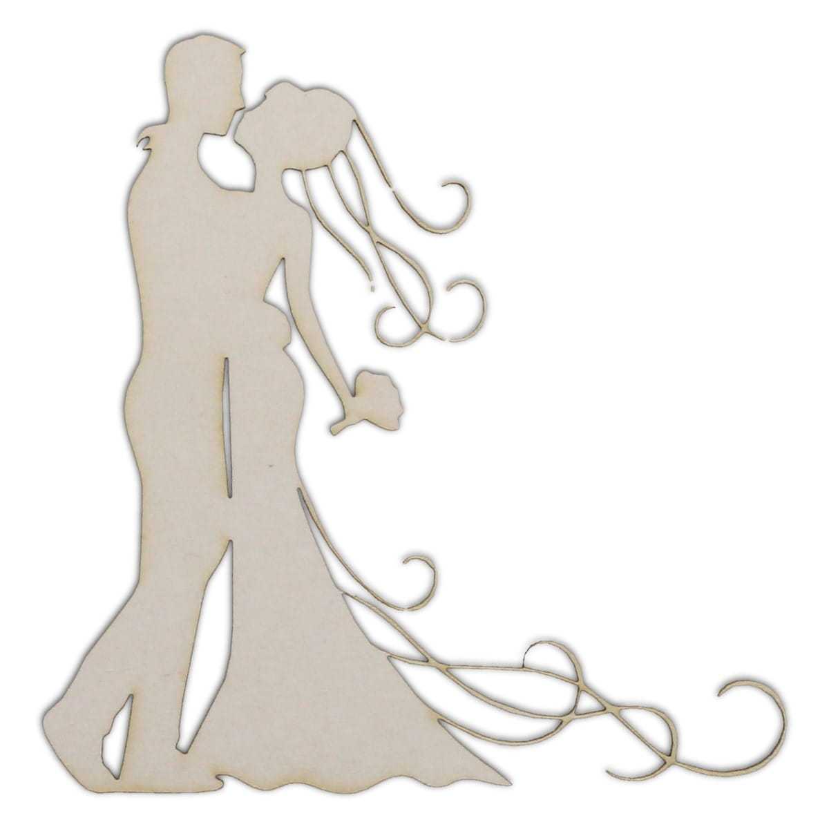 Kartonowa ozdoba ślubna przedstawiająca pocałunek młodej pary. Mężczyzna w idealnie skrojonym garniturze obejmuje kobietę w celu złożenia pocałunku. Kobieta ubrana jest w prostą, elegancką suknię do samej ziemi, w lewej dłoni trzyma bukiet kwiatów, a prawa dłoń obejmuje partnera. Kobieta jest finezyjnie ozdobiona delikatnymi wywijasami, które znajdują się na jej głowie oraz przy sukni.