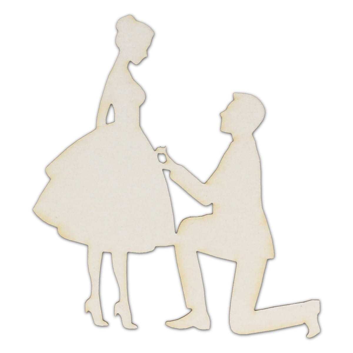 Ozdoba wykonana z kartonu przedstawia scenę oświadczyn. Kobieta w koku ubrana w rozkloszowaną suknię i wysokie szpilki stoi przed partnerem. Mężczyzna elegancko ubrany klęczy przez przyszłą narzeczoną, a w dłoni trzyma pudełeczko z pierścionkiem zaręczynowym. Ozdoba idealnie wpasuje się w ślubny klimat dekoracji. Znajdzie swoje zastosowanie na zaproszeniu ślubnym, dekoracji podarunku dla pary młodej. Dodatkowo ta powszechna scena pasuje do okazji Walentynek.