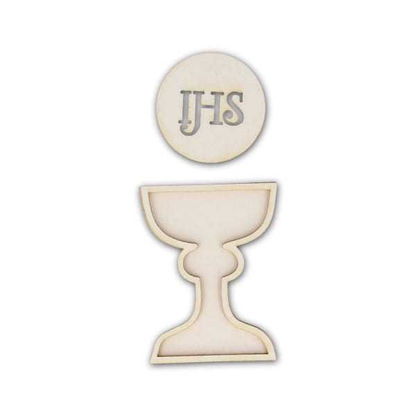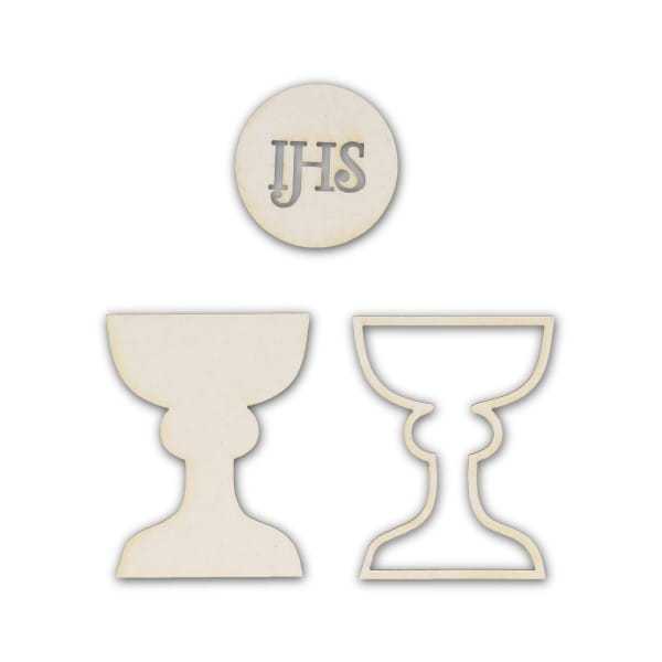 Trójwymiarowy kielich złożony z dwóch warstw oraz prosta hostia uzupełnią kartki z okazji Pierwszej Komunii Świętej.