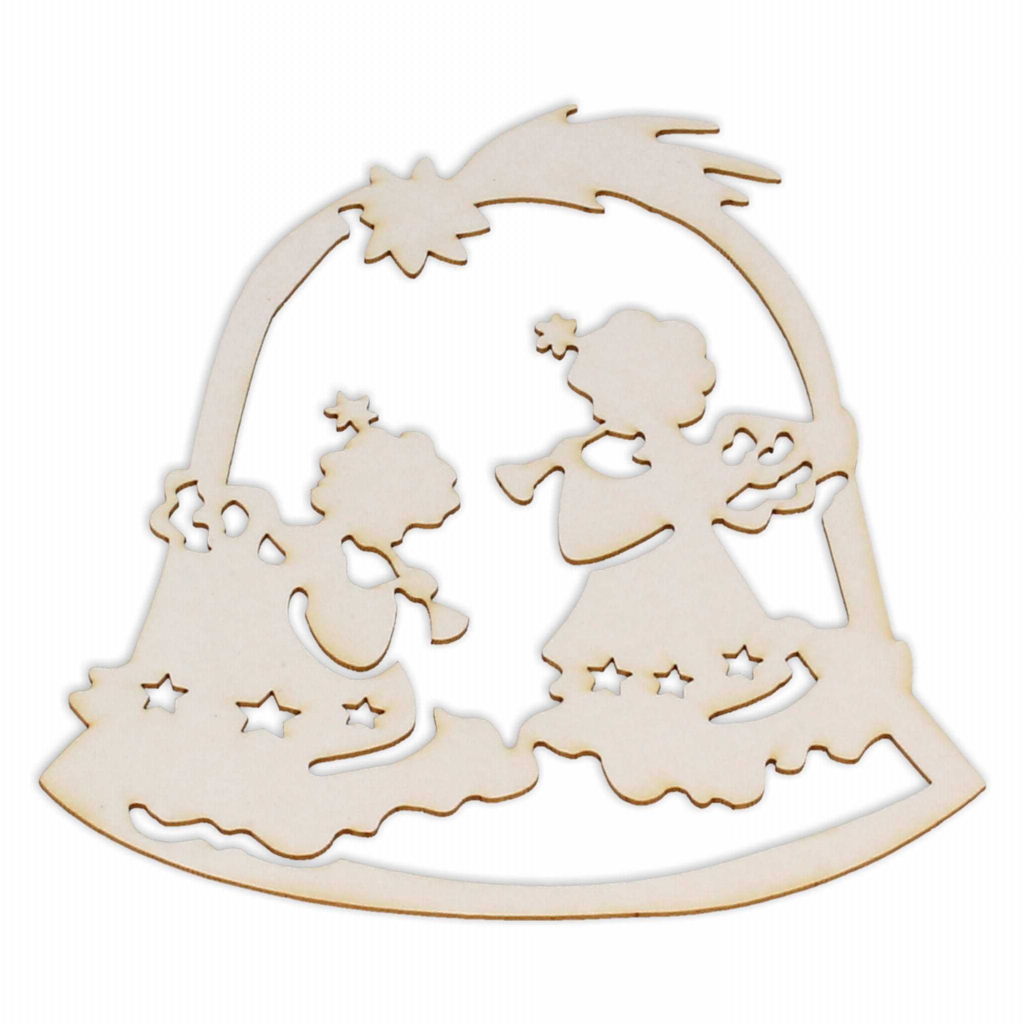 Dekoracja świąteczna wykonana z grubego kartonu. Przedstawia dwa aniołki na chmurkach w świątecznym klimacie.