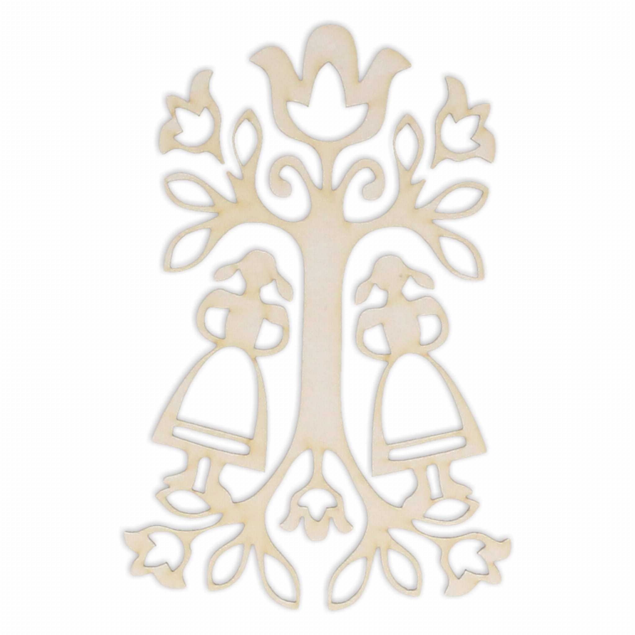 Kartonowa dekoracja ludowa przedstawiająca dwie postaci kobiece pod stylizowanym drzewem.