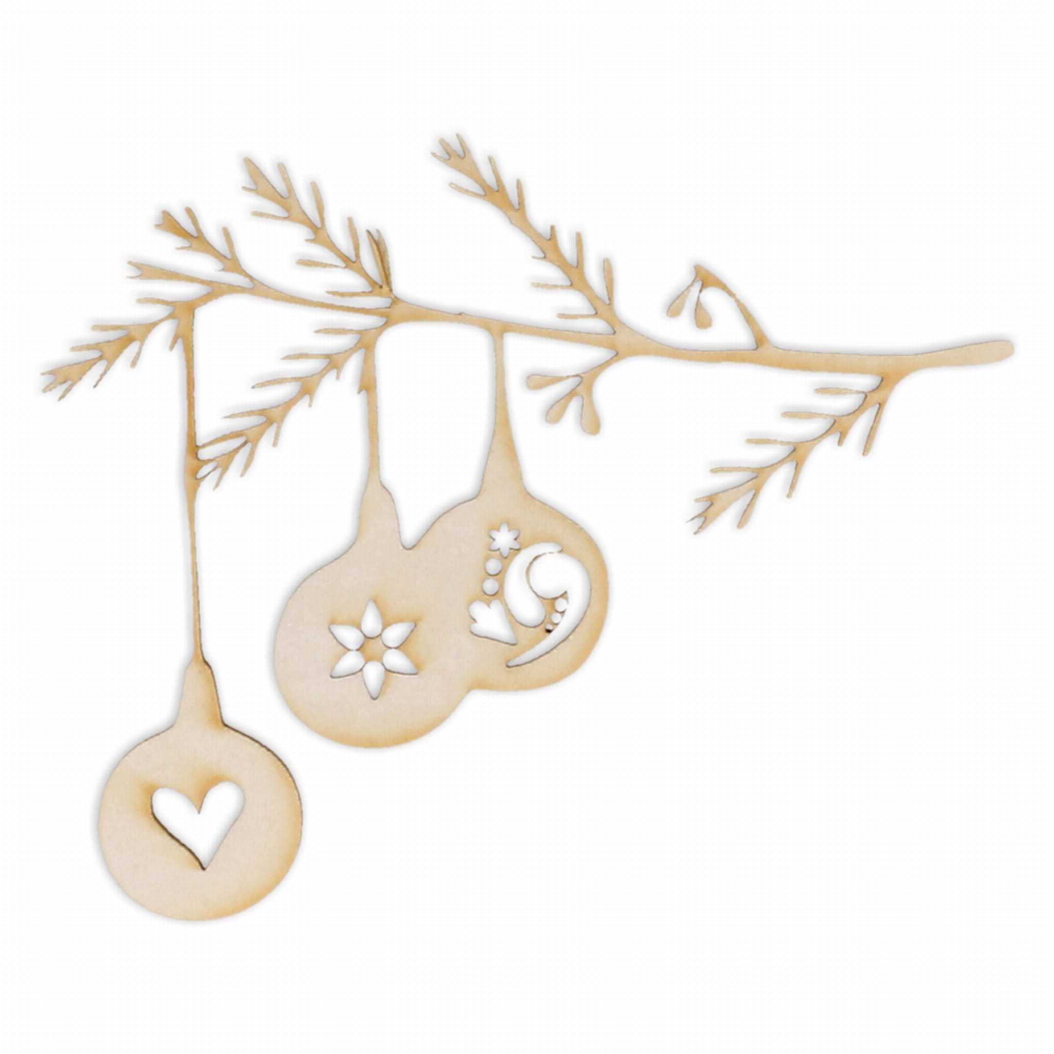 Ażurowa dekoracja z kartonu przedstawiająca iglastą gałązkę ozdobioną delikatnymi bombkami.