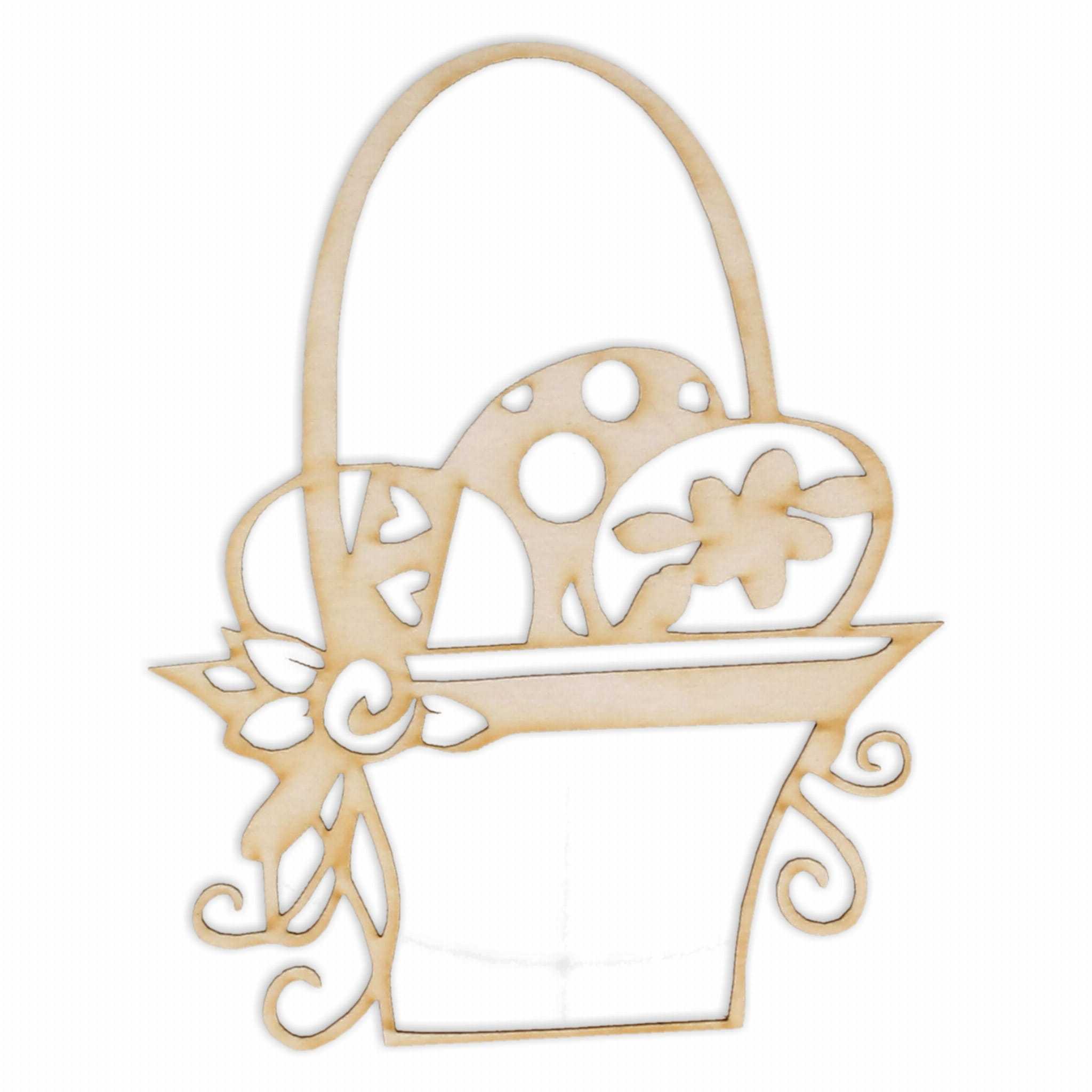 Dekor z kartonu w formie delikatnego wielkanocnego koszyka wypełnionego pisankami.