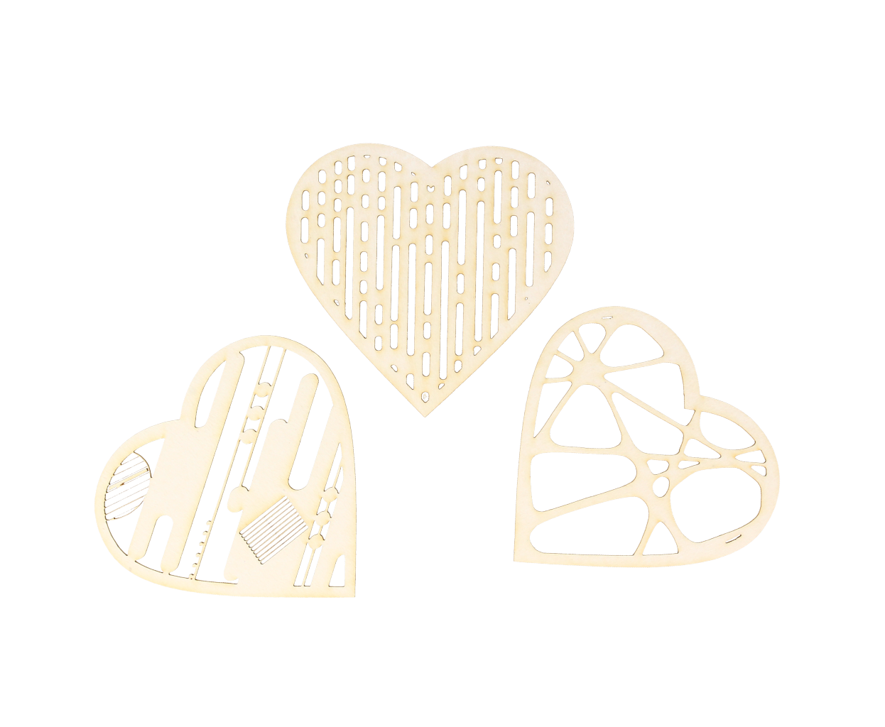 Zestaw 3 ażurowych serc, każde z wyciętym innym motywem.