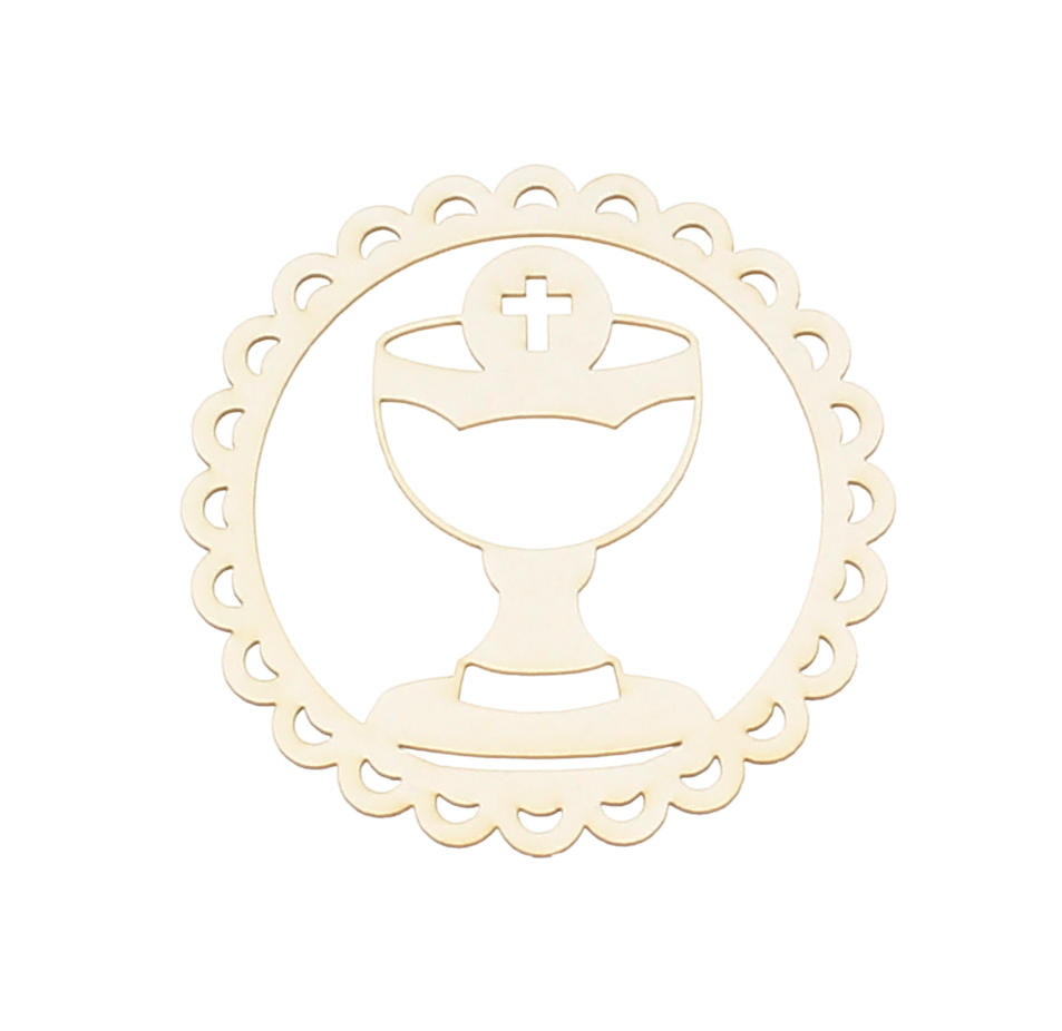 Dekoracja z kartonu przedstawia kielich z hostią w otoczce. Dekoracja sprawdzi się na zaproszeniach, podziękowaniach i albumach komunijnych oraz tych z okazji Chrztu Świętego.