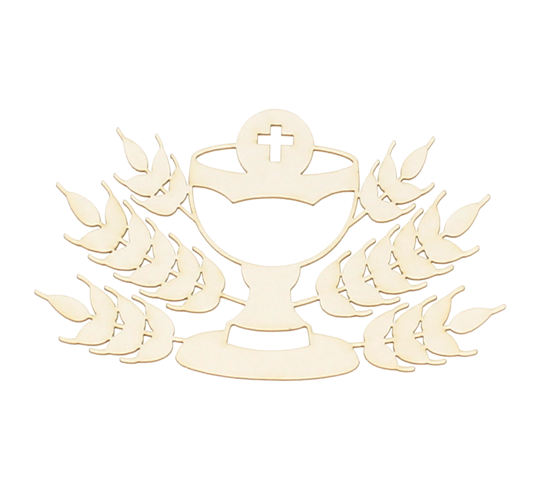 Dekoracja z kartonu przedstawia hostię w kielichu. Dekoracja sprawdzi się na zaproszeniach, podziękowaniach i albumach komunijnych oraz tych z okazji Chrztu Świętego.