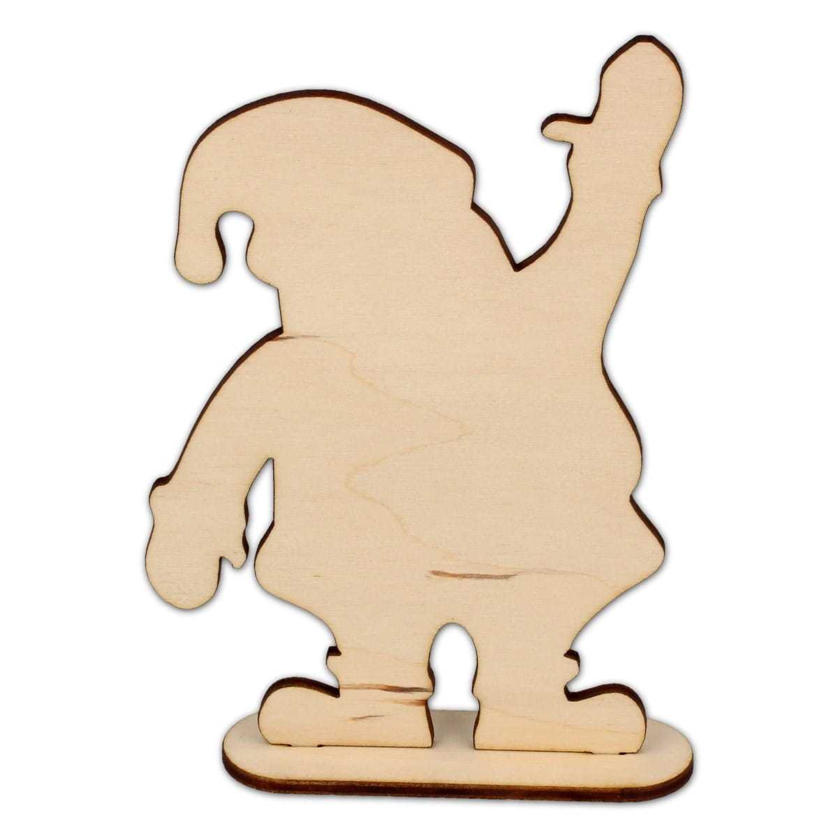 Dekoracja świąteczna ze sklejki w kształcie stojącego Mikołaja. Podstawka dołączona do Mikołaja umożliwia postawienie dekoru bez konieczności podparcia. Doskonale prezentuje się zarówno w formie surowej, jak i ozdobionej rozmaitymi technikami decoupage.
