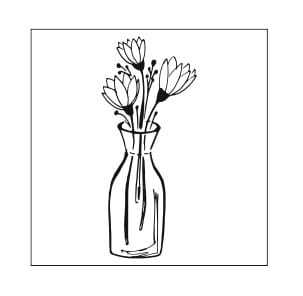 Kwadratowy, gumowy stempel z wiosennym motywem butelki pełnej kwiatów doskonale sprawdzi się do ozdabiania kartek i albumów w stylu boho.