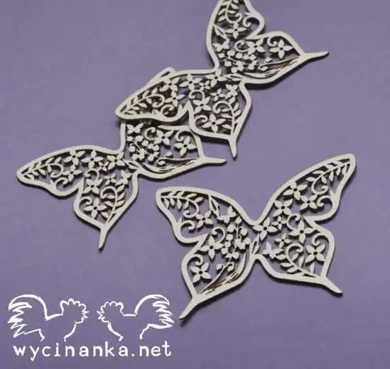 Trzy jednakowe motylki wycięte z tekturki o grubości 1 mm.