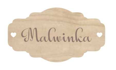 Mała tabliczka z wygrawerowanym imieniem. Otworki w kształcie serduszek mogą pełnić funkcję ozdobną, ale mogą też służyć do zawieszenia bądź przyszycia tabliczki. Możesz ją wykorzystać jako brelok, tabliczkę na drzwi lub pudełko ze skarbami, czy też na inne sposoby.