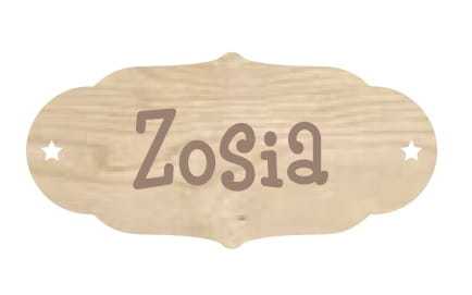 Mała tabliczka z wygrawerowanym imieniem. Otworki w kształcie gwiazdek mogą pełnić funkcję ozdobną, ale mogą też służyć do zawieszenia bądź przyszycia tabliczki. Możesz ją wykorzystać jako brelok, tabliczkę na drzwi lub pudełko ze skarbami, czy też na inne sposoby.